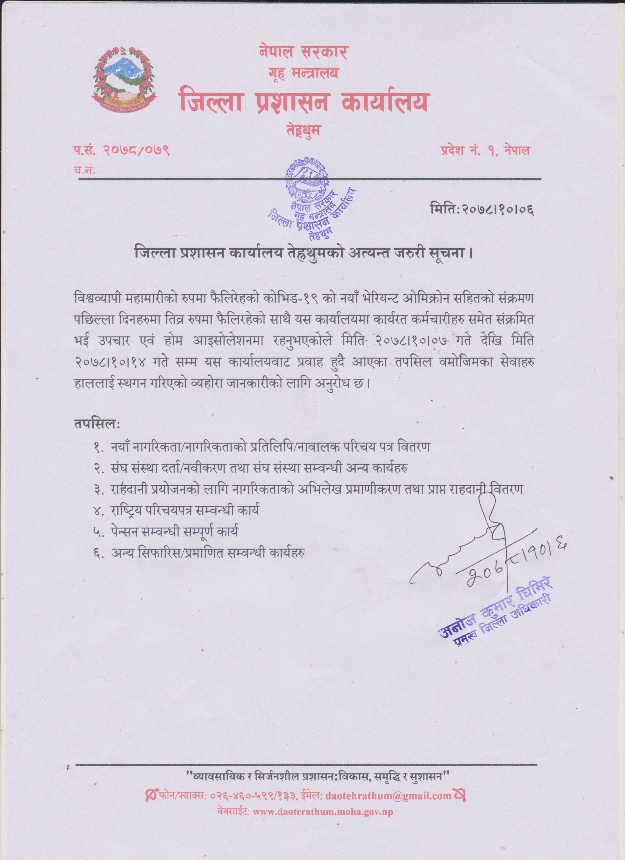 जिल्ला प्रशासन कार्यालय, तेह्रथुमकाे अत्यन्त जरुरी सुचना ।