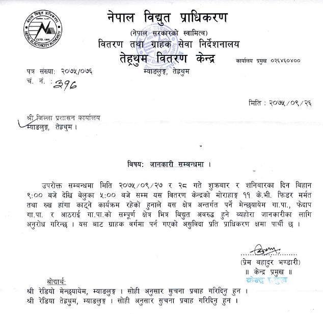 नेपाल विद्युत प्राधिकरण तेह्रथुम वितरण केन्द्रको सुचना ।