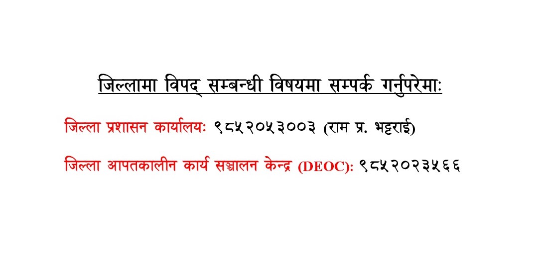 जिल्लामा विपद् सम्बन्धी विषयमा सम्पर्क गर्नुपरेमा सम्पर्क नं.