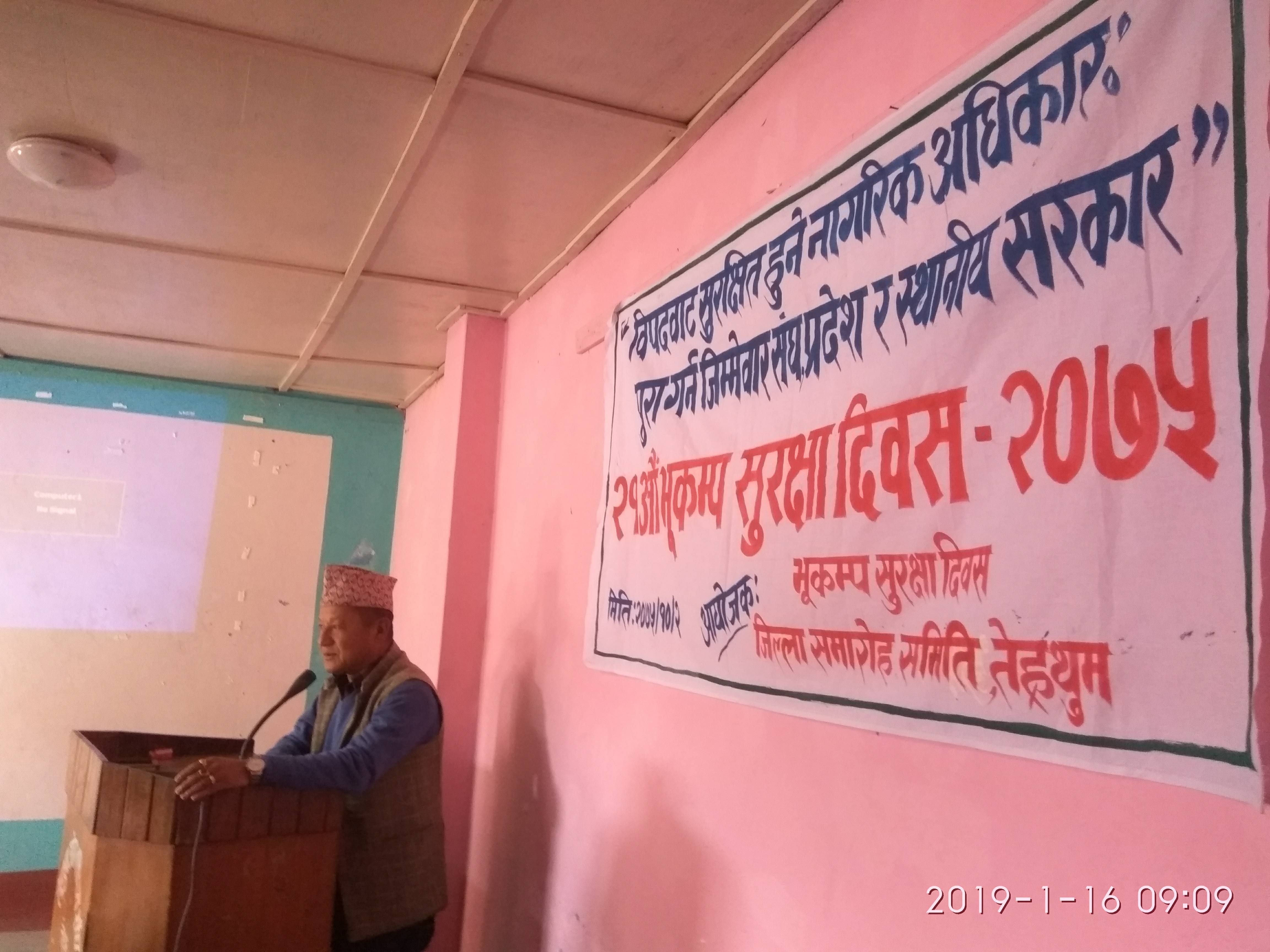 भुकम्प सुरक्षा सम्बन्धि अन्तरक्रिया कार्यक्रममा मन्तब्य राख्नुहुदै म्याङ्लुङ्ग नगरपालिकाका नगर प्रमुख