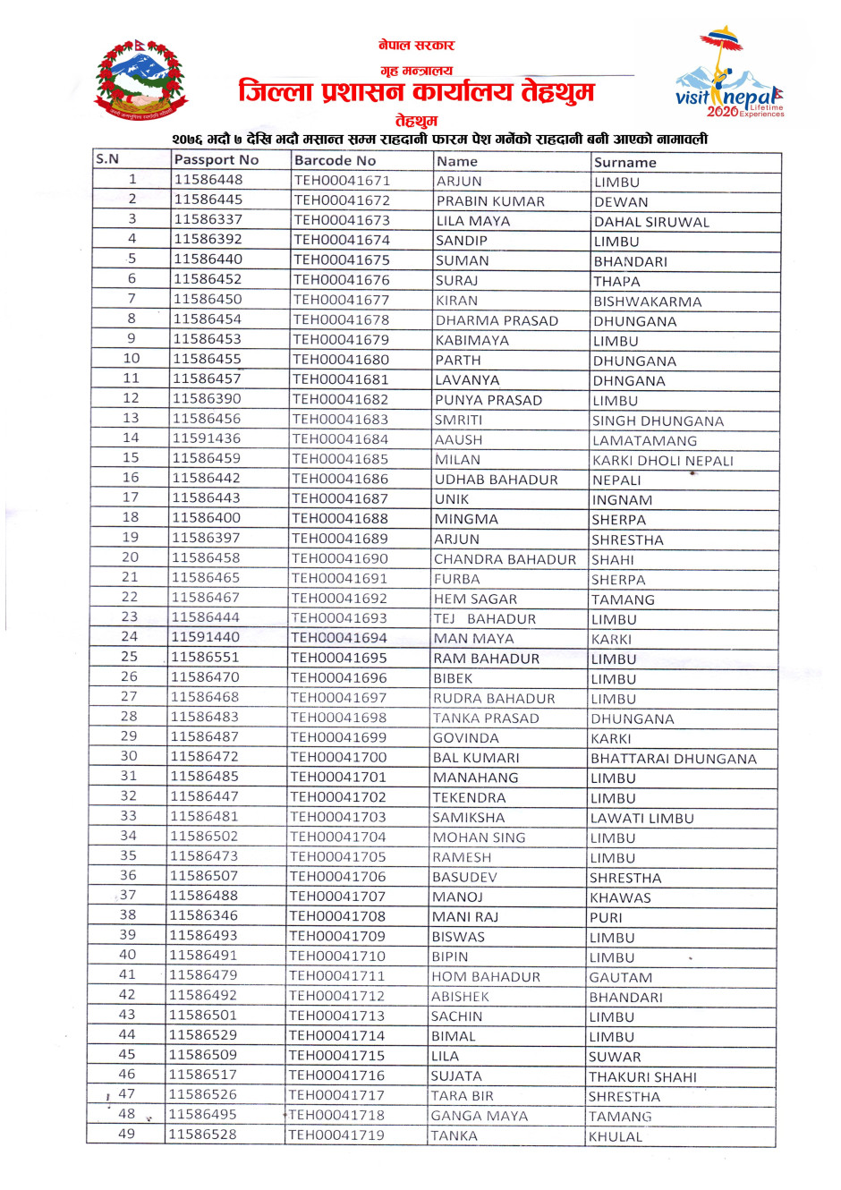 २०७६ भदौ ७ गतेदेखि २०७६ भदौ मसान्त सम्म फाराम पेश गर्ने आवेदकहरुको राहदानी (MRP) बनी आएको सूचना ।