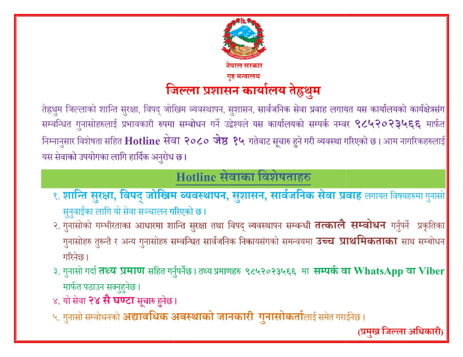 हटलाईन सेवा सञ्चालन सम्बन्धी सूचना