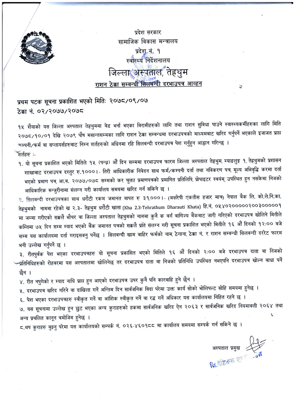 तस्बिर : जिल्ला अस्पताल, तेह्रथुमको राशन ठेक्का सम्बन्धी सिलबन्दी दरभाउपत्र आव्हन सम्बन्धी सूचना ।