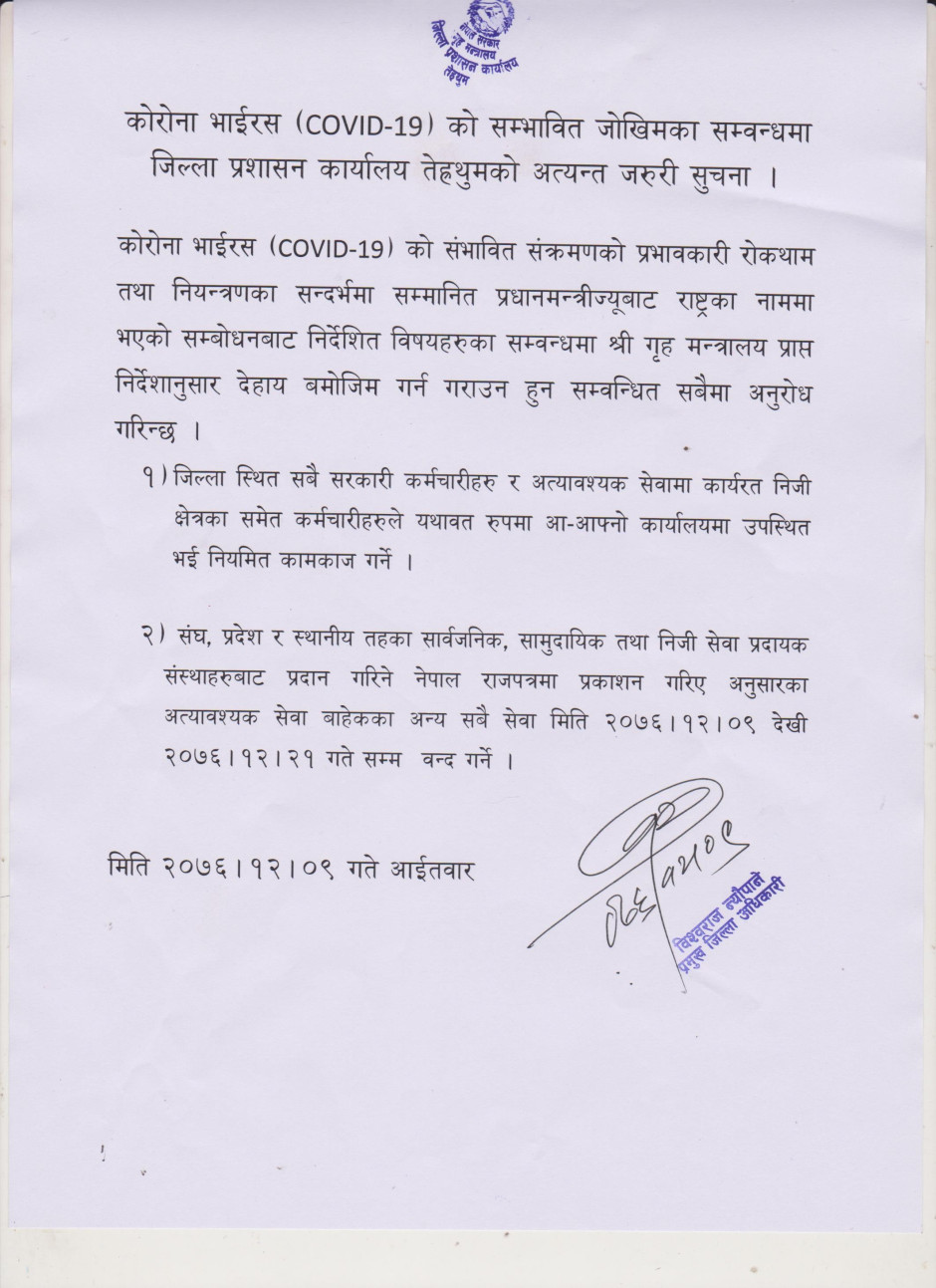 कोरोना भाईरस (COVID-19) को सम्भावित जोखिमका सम्बन्धमा जिल्ला प्रशासन कार्यालय तेह्रथुमको अत्यन्त जरुरी सुचना ।