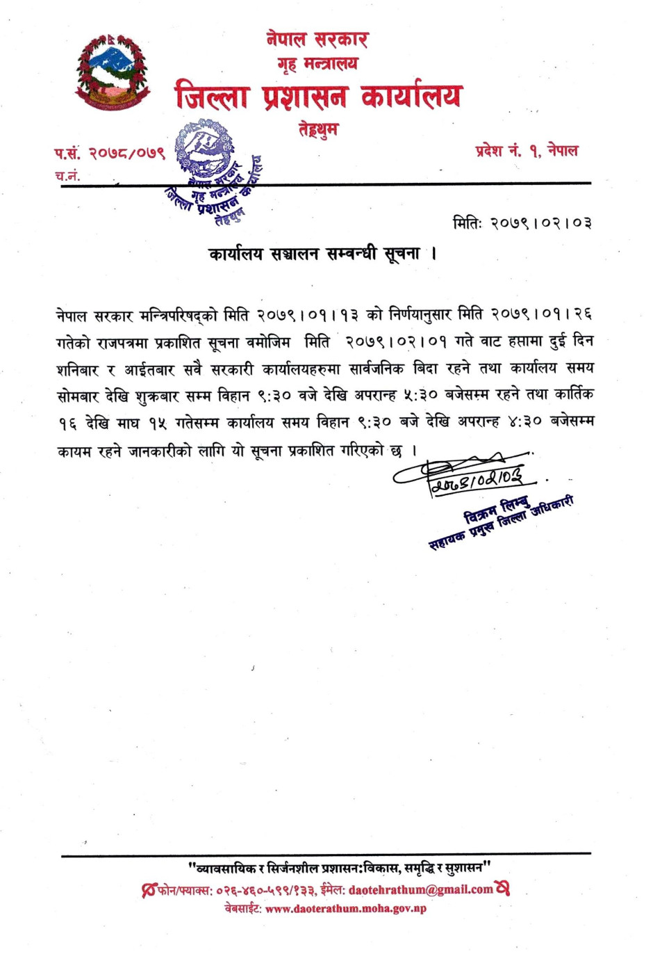 कार्यालय सञ्चालन सम्बन्धी सूचना ।