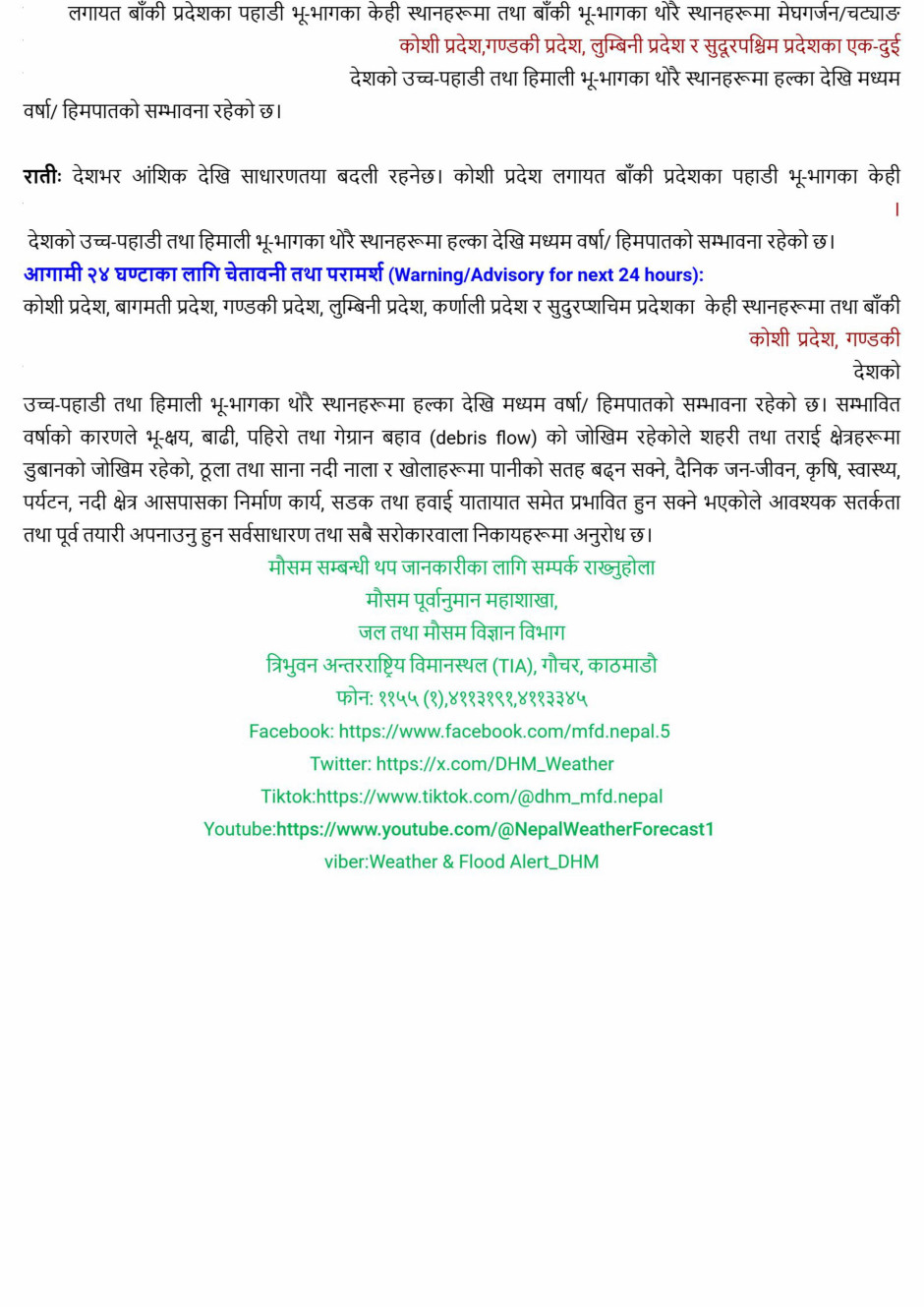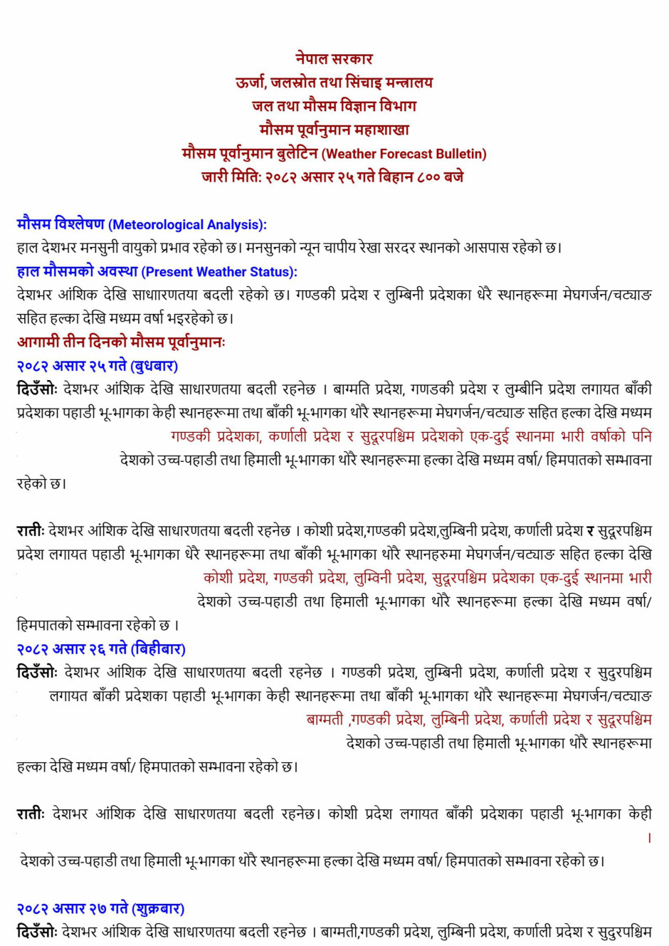 मौसम पूर्वानुमान बुलेटिन (Weather Forecast Bulletin) जारी मितिः २०८२ असार २५ गते बिहान ८०० बजे