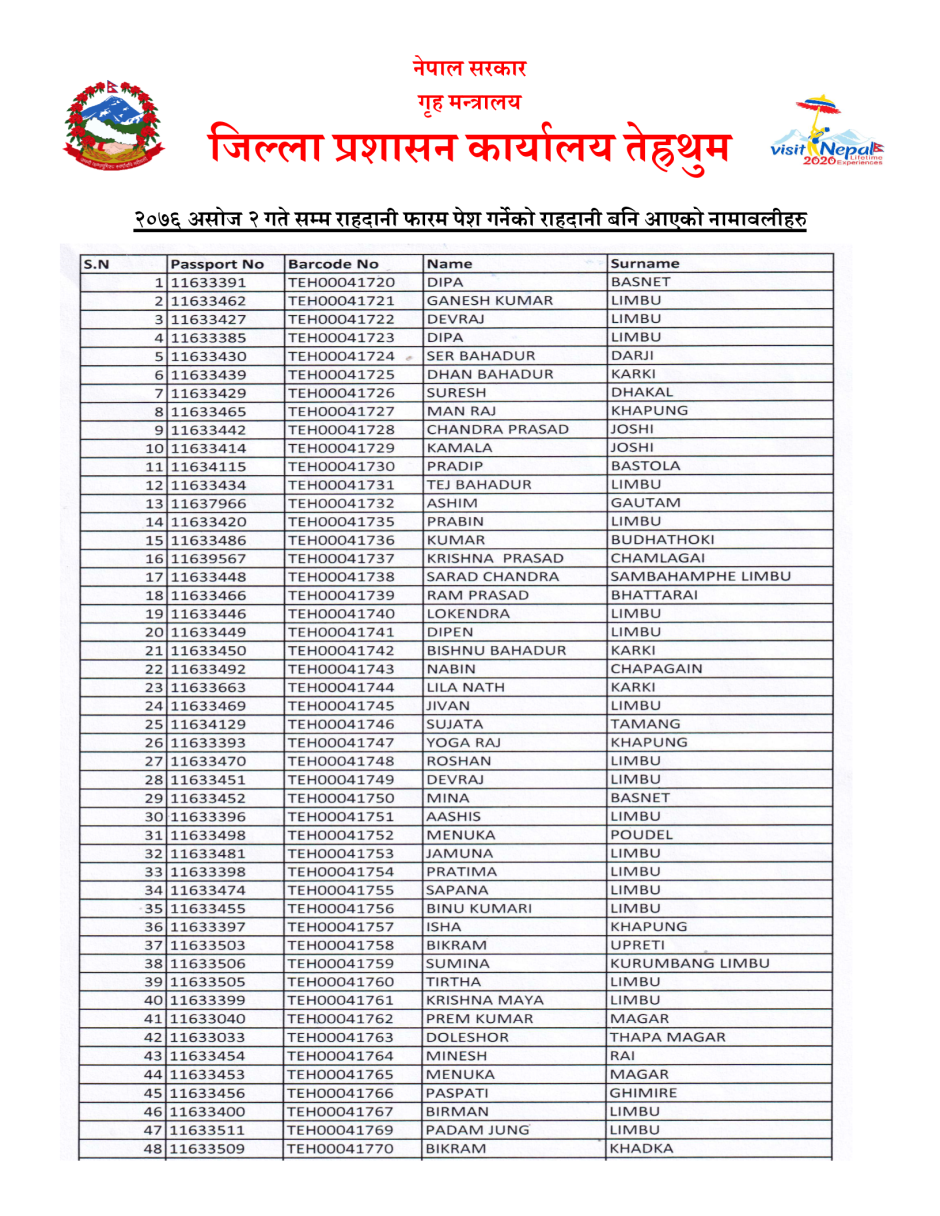 मिति २०७६ साल असोज २ गते सम्म यस कार्यालयमा राहदानी (M.R.P) फाराम पेश गर्नेहरुको राहदानी बनी आएकोले वितरण भईरहेको जानकारी गरिन्छ ।