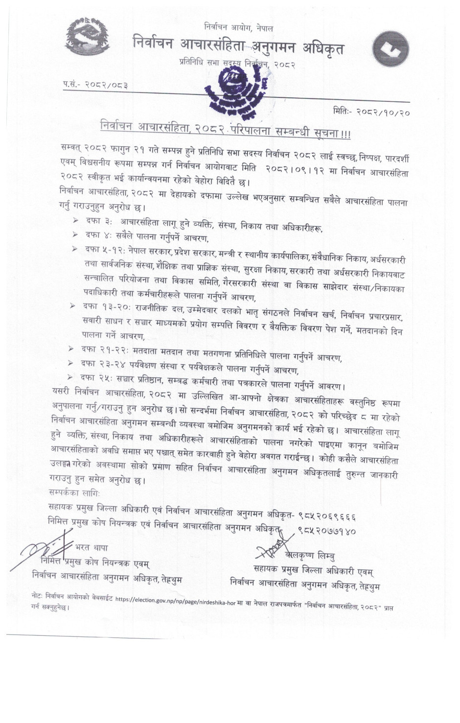 निर्वाचन आचारसंहिता, २०८२ परिपालना सम्बन्धी सूचना !!!