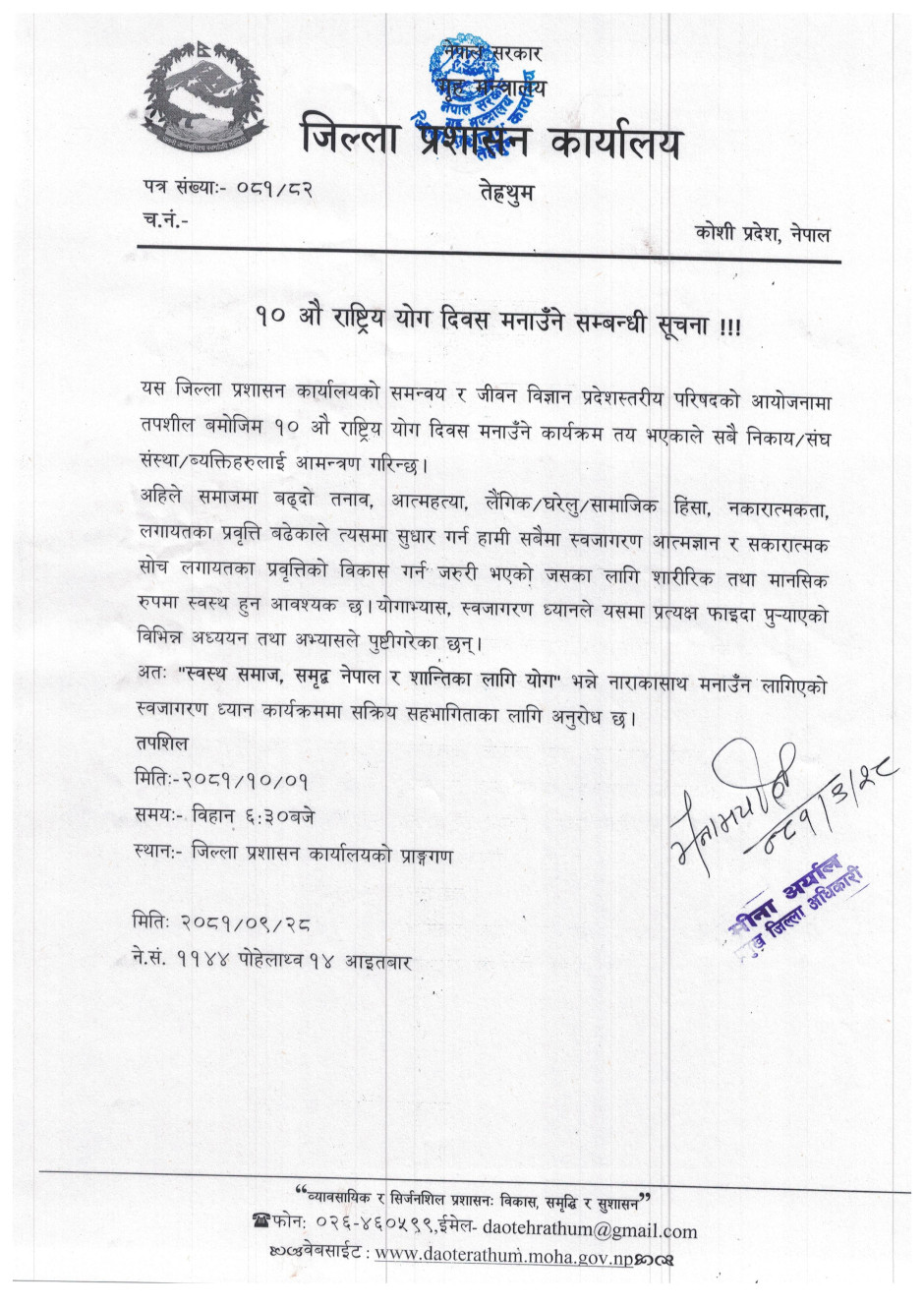 १० औ राष्ट्रिय योग दिवस मनाउँने सम्बन्धी सूचना !!!