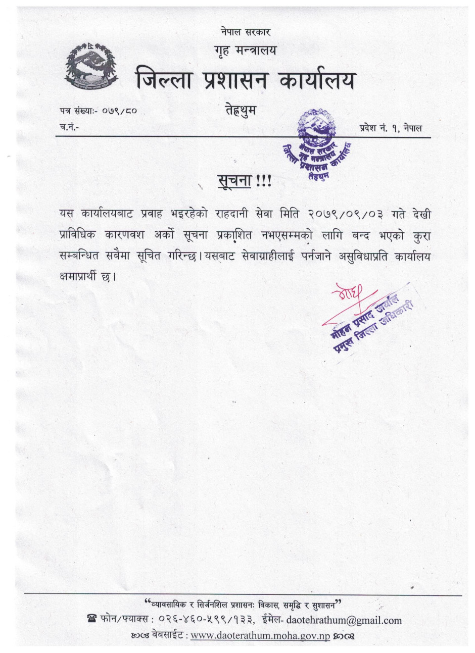 © सर्वाधिकार सुरक्षित जिल्ला प्रशासन कार्यालय, तेह्रथुम