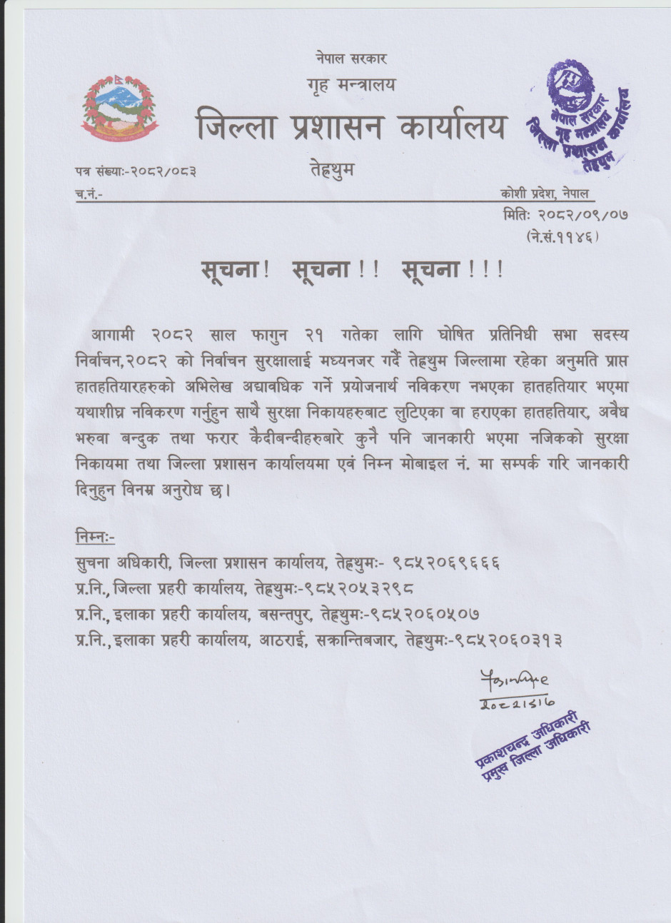 © सर्वाधिकार सुरक्षित जिल्ला प्रशासन कार्यालय, तेह्रथुम