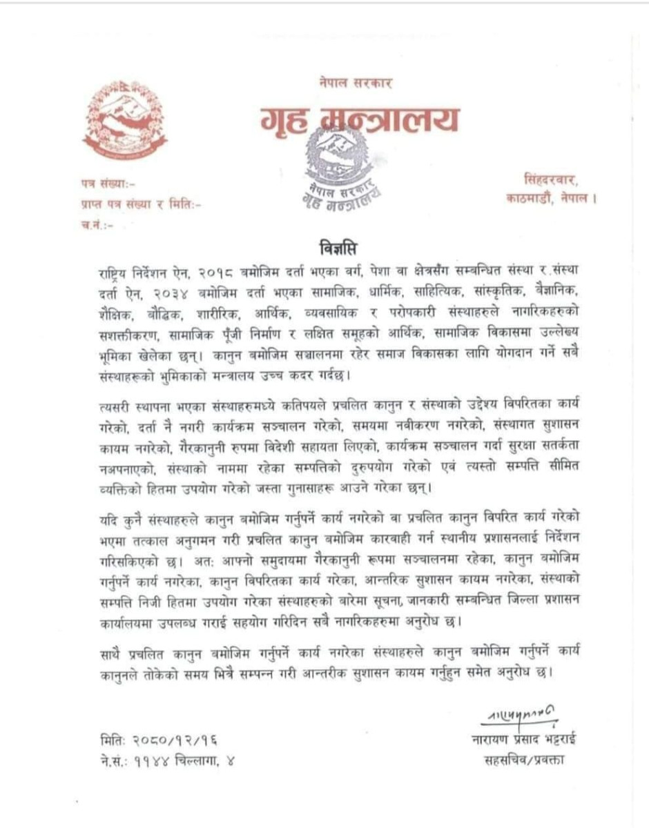 संघ संस्थाहरुले सुशासन कायम गर्ने सम्बन्धी गृह मन्त्रालयको विज्ञप्ति