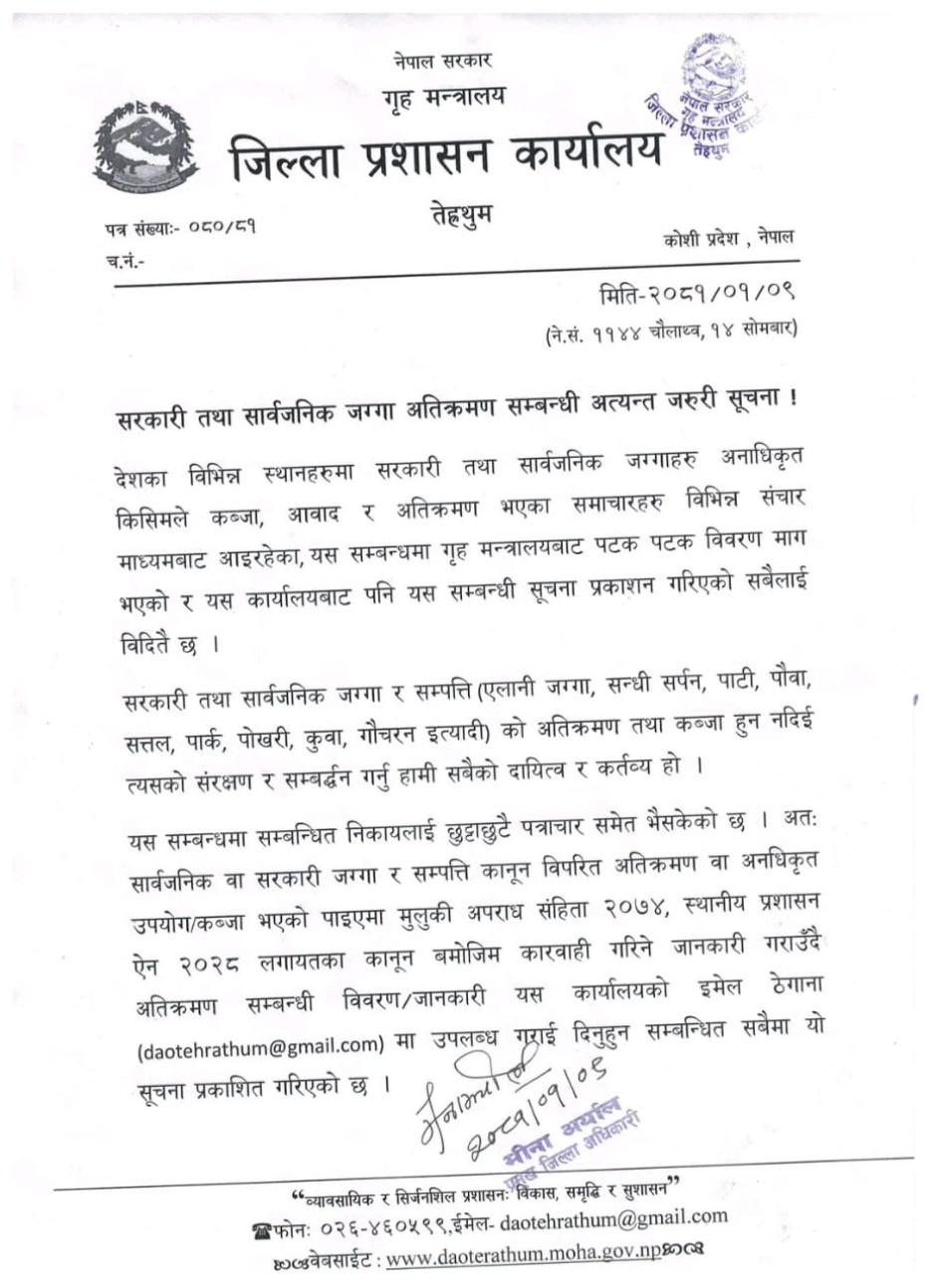 सरकारी तथा सार्वजनिक जग्गा अतिक्रमण सम्बन्धी अत्यन्त जरुरी सूचना !!!