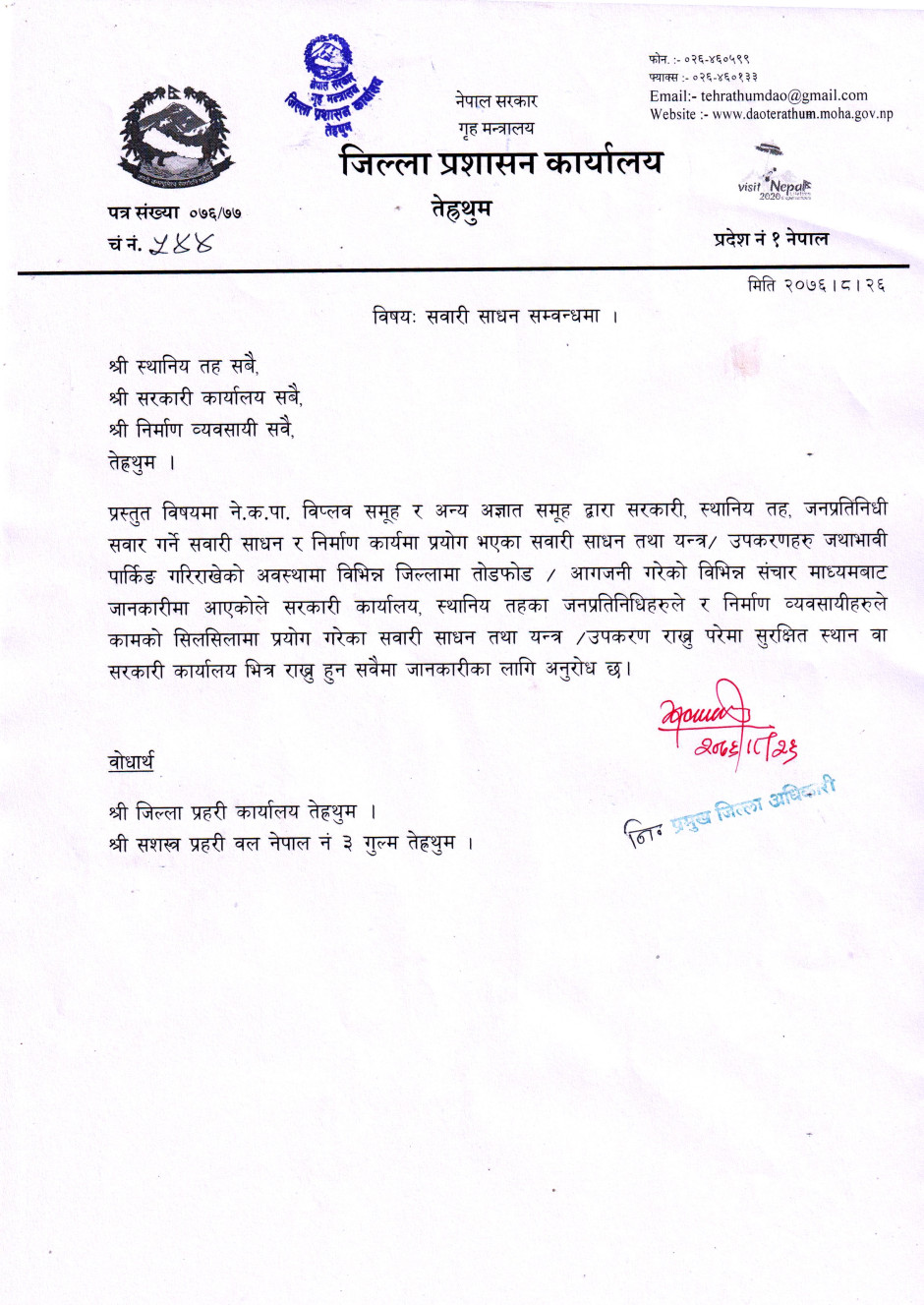 तस्बिर : सवारी साधन तथा यन्त्रहरु सुरक्षित स्थान वा सरकारी कार्यालय भित्र राख्ने बारे अत्यन्त जरुरी सूचना ।