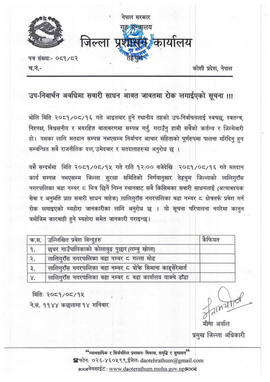 उप-निवार्चन अवधिमा सवारी साधन आवत जावतमा रोक लगाईएको सूचना !!!